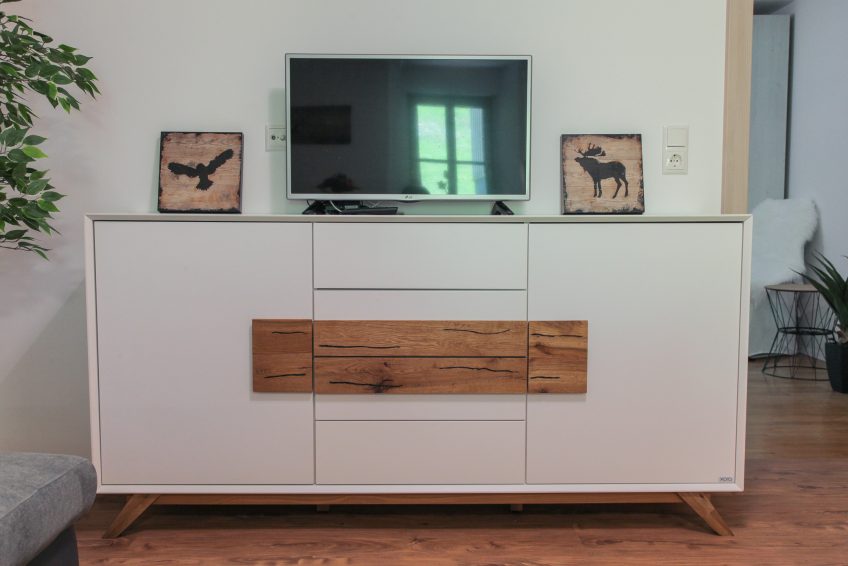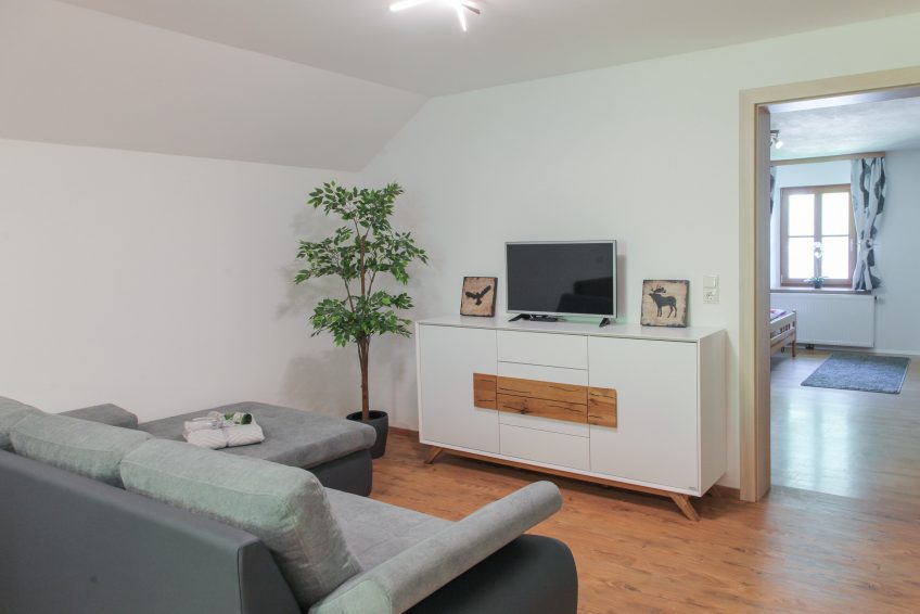 Hier finden Sie eine sehr gemütliche Wohnlandschaft. Außerdem finden Sie hier einen Fernseher und eine Kommode, in der Sie genügend Stauraum finden.